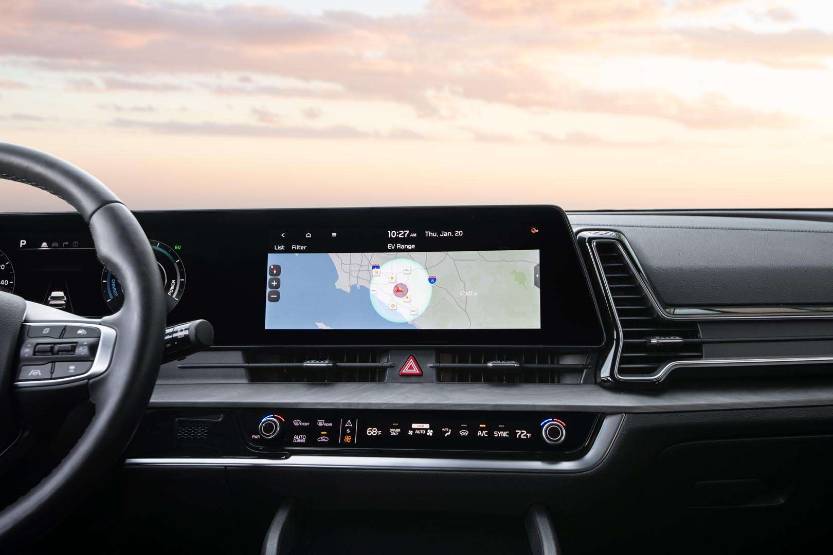 Dans les deux cas, une transmission automatique traditionnelle à six rapports – plutôt que huit dans les Sportage non électrifiés – relaie le couple aux quatre roues. Contrairement à Mitsubishi et Toyota, qui confient à un moteur électrique distinct la tâche d’alimenter le train arrière, Hyundai et Kia emploient un rouage intégral classique doté d’un arbre de transmission. Jusqu’à la moitié du couple est acheminé à l’arrière en cas de perte d’adhérence, en virage serré ou en forte accélération. Le véhicule se comporte comme un modèle à traction en conduite normale.